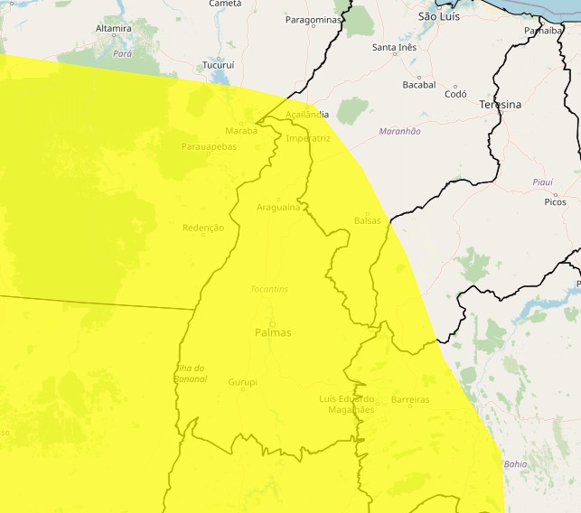 Tocantins está com um alerta amarelo que vai até às 10h desta quinta-feira (7). Segundo o Inmet, a possibilidade é de chuvas com 20 a 30 mm/h ou até 50 mm/dia, além de ventos intensos de 40 a 60 km/h.