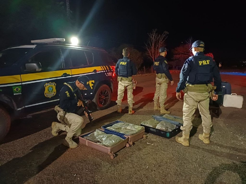 O veículo foi parado durante uma fiscalização no posto da PRF, no km 666. Os entorpecentes estavam divididos em duas malas.