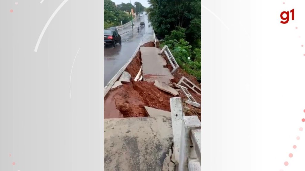 Desmoronamento aconteceu em trecho da Avenida Bernardo Sayão em Paraíso do Tocantins. Segundo a prefeitura, local passará por reparos. Calçada de ponte desmorona após chuva forte